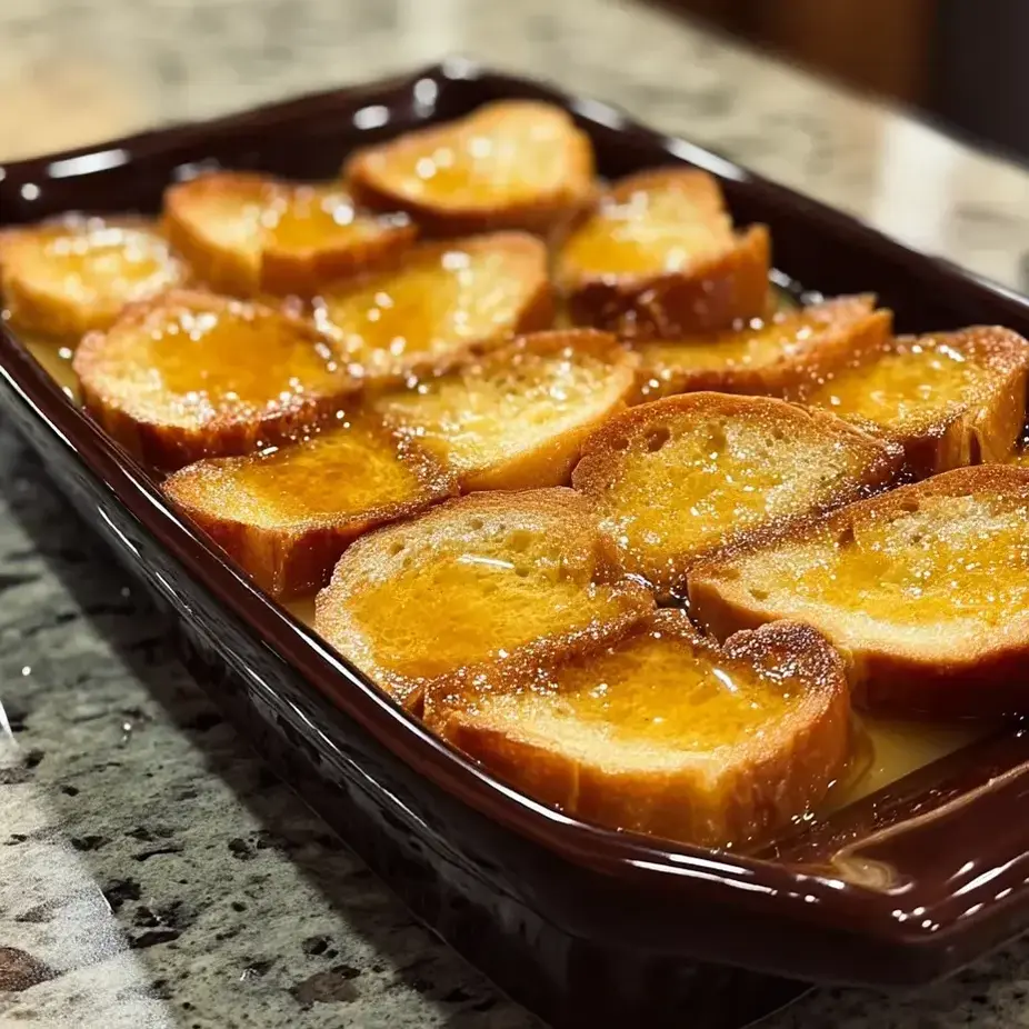 This French toast tastes best right from the oven with a light sprinkle of powdered sugar on top. Add some fresh berries for a tangy contrast to all that sweetness. You don't really need maple syrup since the caramelized sugar makes its own amazing sauce, but I always put a small jug on the table so folks can add more if they want. I like to round out the meal with some crispy bacon or breakfast sausages to balance out the sweet flavors.